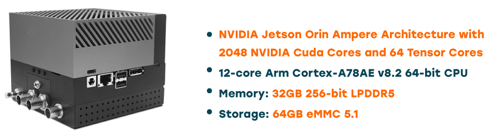 ・NVIDIA Jetson Orin Ampereアーキテクチャ、2048個のNVIDIA Cudaコアと64個のTensorコアを搭載