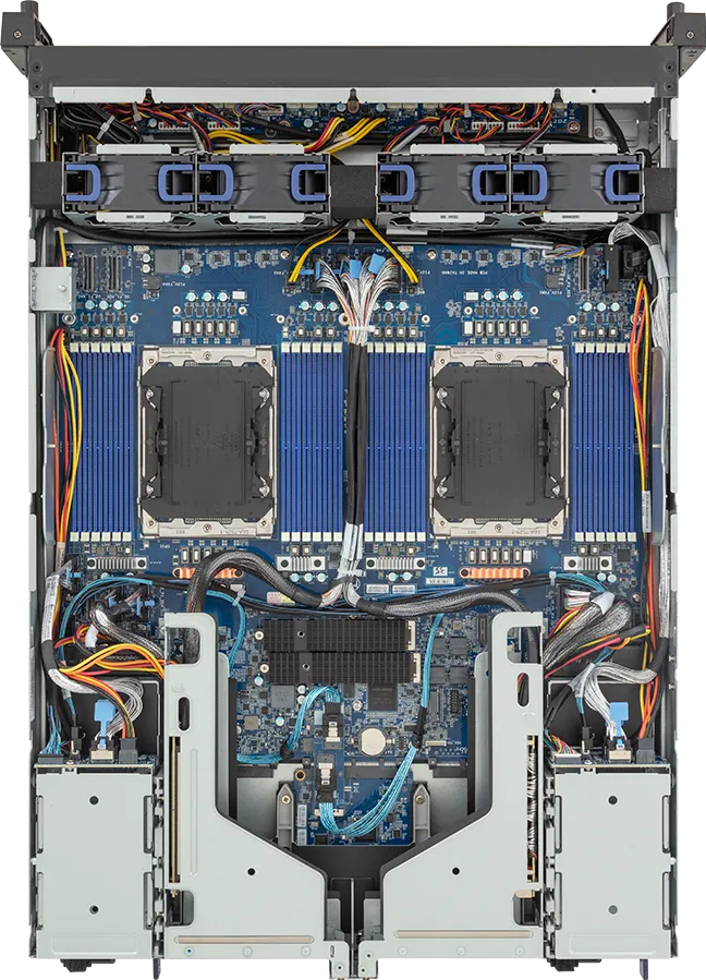 | Storage | Rear hot-swap: 4 x 2.5″ Gen5 NVMe/SATA/SAS-4 [1] – (2 x NVMe from CPU_0, 2 x NVMe from CPU_1) – (SATA from CPU_0, through I/O board) Internal M.2: 2 x M.2 (2280/22110), PCIe Gen5 x4, from CPU_0 Internal M.2 (I/O board): 1 x M.2 (2280), PCIe Gen5 x2, from CPU_0, occupied for SATA [1] SASドライブを使用するには、SASカードが必要です。 |