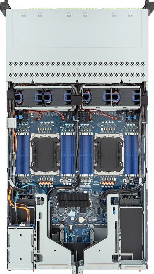 | Storage | Front hot-swap: 36 x E3.S Gen5 NVMe – (16 x NVMe from CPU_0, 20 x NVMe from CPU_1) Rear hot-swap: 2 x 2.5″ SATA/SAS-4 [1] – (SATA from CPU_0, through I/O board) Internal M.2: 2 x M.2 (2280/22110), PCIe Gen5 x4, from CPU_0 Internal M.2 (I/O board): 1 x M.2 (2280), PCIe Gen5 x2, from CPU_0, occupied for SATA [1] SASドライブを使用するには、SASカードが必要です。 |