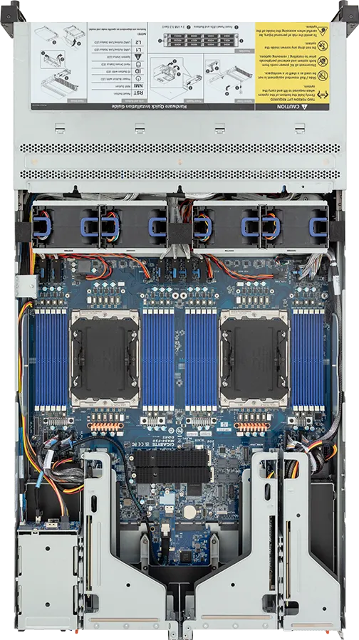 | Storage | Front hot-swap: 12 x 3.5″/2.5″ Gen5 NVMe/SATA/SAS-4 [1] – (4 x NVMe from CPU_0, 8 x NVMe from CPU_1) Rear hot-swap: 2 x 2.5″ SATA/SAS-4 [2] – (SATA from CPU_0, through I/O board) Internal M.2: 2 x M.2 (2280/22110), PCIe Gen5 x4, from CPU_0 Internal M.2 (I/O board – CDCR010): 1 x M.2 (2280), PCIe Gen5 x2, from CPU_0, occupied for SATA [1] SATAおよびSASドライブに対応するには、ストレージカードが必要です。 [2] SASドライブに対応するには、SASカードが必要です。 |
