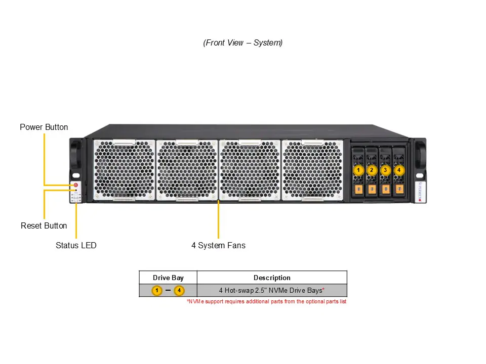 | Drive Bays Configuration | Default: Total 4 bays4 rear hot-swap 2.5″ NVMe* drive bays View Drive Options |