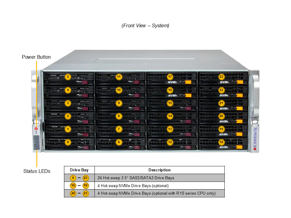 | Drive Bays Configuration | Default: Total 38 bays24 front hot-swap 3.5″ SAS/SATA drive bays 12 rear hot-swap 3.5″ SAS/SATA drive bays 2 rear hot-swap 2.5″ SAS/SATA drive bays View Drive Options |