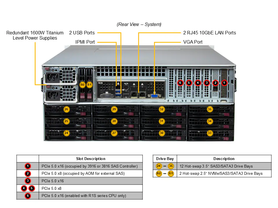 4U UP フロント/リアローディングストレージサーバー、36基のホットスワップ対応3.5インチSAS/SATAベイ(SAS HBA搭載)、PCIe 5.0対応